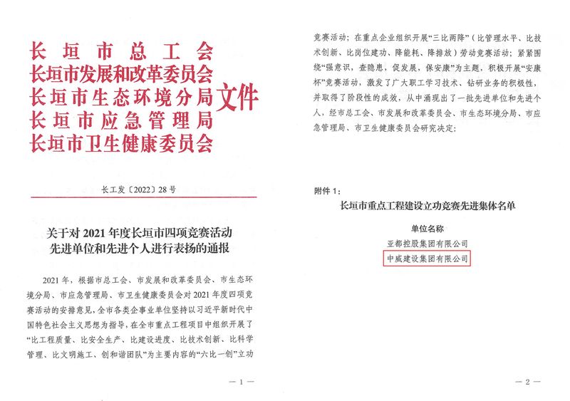 在長垣市總工會、長垣市發(fā)展和改革委員會組織的2021年全市重點工程建設項目開展的“比工程質(zhì)量、比安全生產(chǎn)、比建設進度、比技術創(chuàng)新、比科學管理、比文明施工、創(chuàng)和諧團隊”為主要內(nèi)容的“六比一創(chuàng)”立功競賽活動中,中威集團榮獲2021年度長垣市“重點工程建設立功競賽先進集體”榮譽稱號。