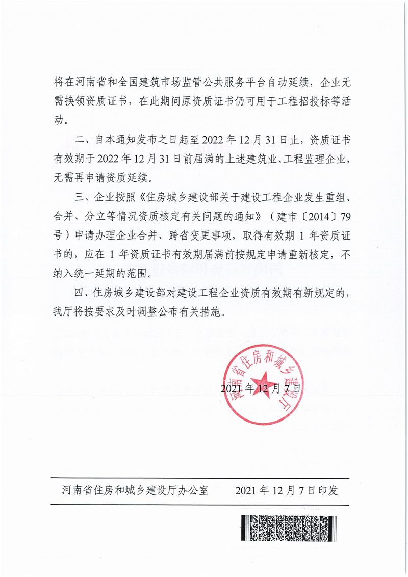 ? ? ? ?建設工程企業資質有效期于2021年12月31日至2022年12月30日期間屆滿的,統一延至2022年12月31日。企業資質證書有效期將在河南省住房和城鄉建設廳、全國建筑市場監管公共服務平臺自動延續,企業不需換發資質證書,在此期間原資質證書仍可用于工程招投標等活動。