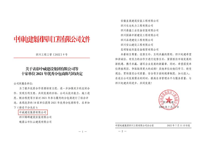 行業要聞 | 中威集團被中國電建集團四川工程有限公司授予“2021年度優秀分包商”榮譽稱號