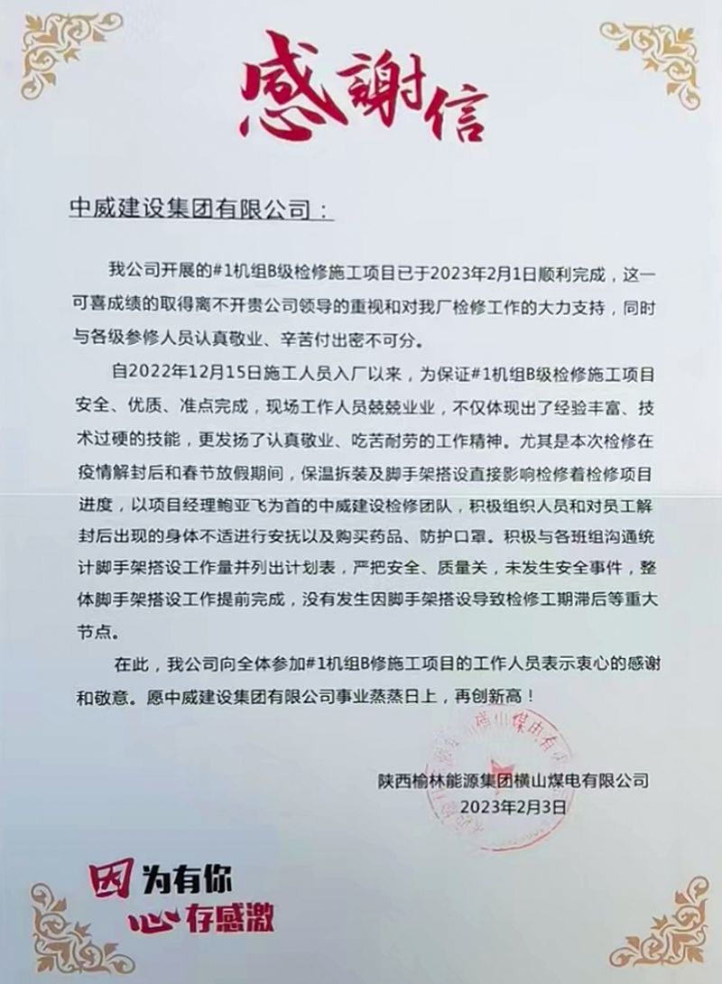三月春風(fēng)暖,姹紫嫣紅時(shí)。在楊柳如煙、春色如畫(huà)的陽(yáng)春時(shí)節(jié),中威集團(tuán)副總經(jīng)理王李豪及其率領(lǐng)的團(tuán)隊(duì),在陜西榆林能源集團(tuán)橫山煤電有限公司#1機(jī)組B級(jí)檢修施工過(guò)程中,組織得力、措施到位、管理科學(xué)、工藝先進(jìn),使得該項(xiàng)目順利推進(jìn)并圓滿(mǎn)完成,得到了甲方的高度認(rèn)可與充分肯定,取得了良好的經(jīng)濟(jì)效益和社會(huì)效益。